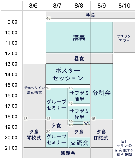 交流会は第52回から始まる新しい試みです。夏の学校は、同年代の全国に散らばる研究者達が集まる場です。また、興味ある分野や専門と