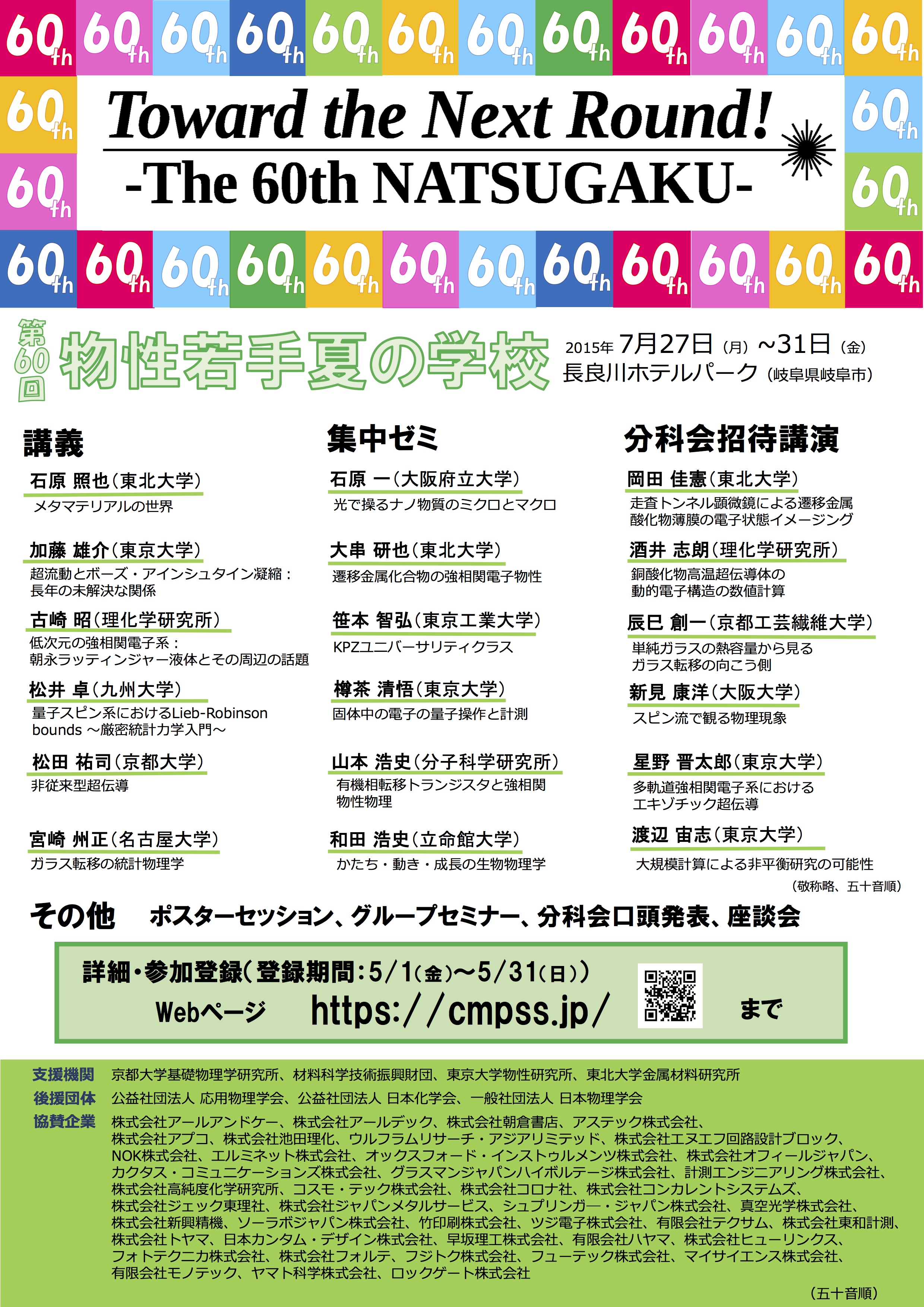 今年も研究機関や財団からのご援助、学会からのご後援、協賛企業・個人協賛からのご支援、そして先生方のご好意を賜り夏の学校も無事60回を開催することができますことを、この場を借りてお礼申し上げます。